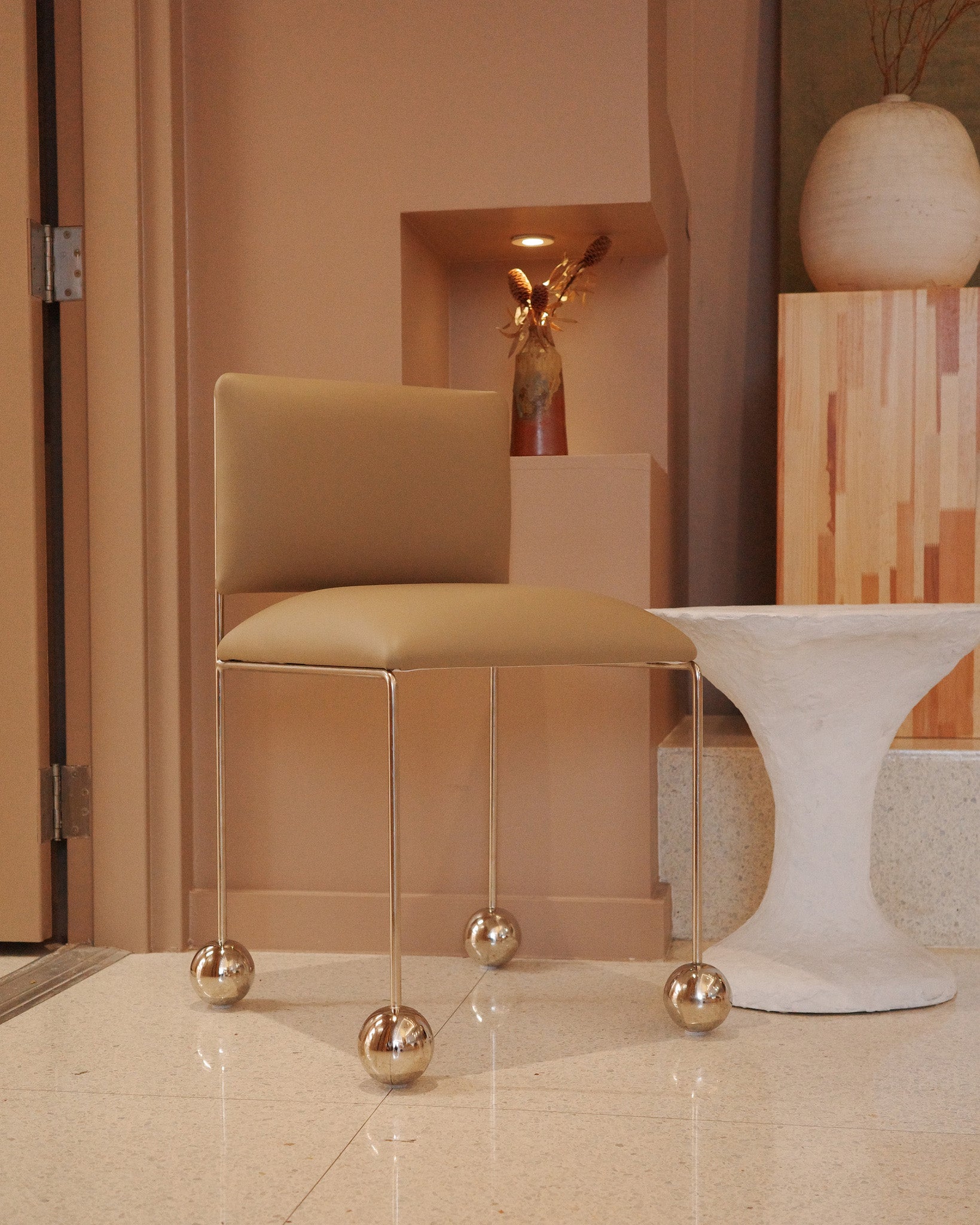The “Ball-Foot Chair” is upholstered with a subtle beige cactus leather, a vegan textile infused with natural cacti fibers, which is produced in Mexico. The chair’s comfortable and rounded seat is playfully in dialogue with its distinctive spherical extremities. Appearing like an object left behind by a failed future, the “Ball-Foot Chair” revisits a melancholic hope for utopian visions.